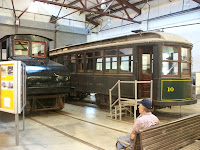 The centerpiece of the museum is their visitor's center, an enormous and attractive brick building housing a four-track display hall, entry hall, gift shop, movie theater, library and member's meeting room. The building surpasses anything built at IRM - it's of the quality of our diner annex but many times as large. Below, Randy Hicks sits in the display hall contemplating two of the gems of the CTM collection: the oldest existing two-truck steeplecab, an 1894 GE, and Springfield Terminal 10, a combine dating to 1901 that has been owned by CTM for over 60 years.